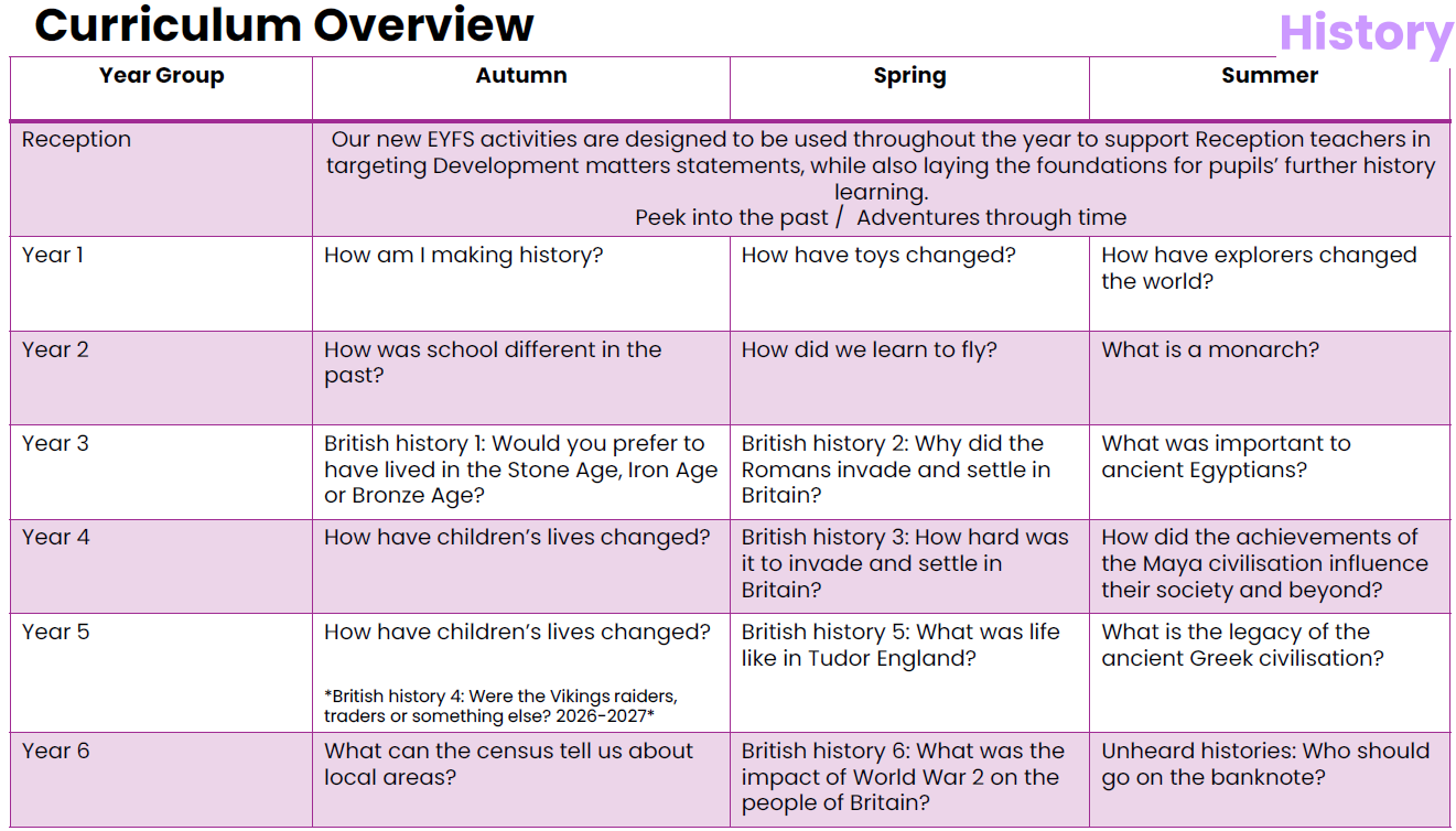 The curriculum is our model of progression. Knowledge (disciplinary and substantive) increases in complexity from EYFS through to the end of KS2 in a carefully structured sequence. Our curriculum empowers children to make sense of the world around them and the multiple identities we all navigate as British Citizens in a global society; broadening and deepening a curiosity about people and place.